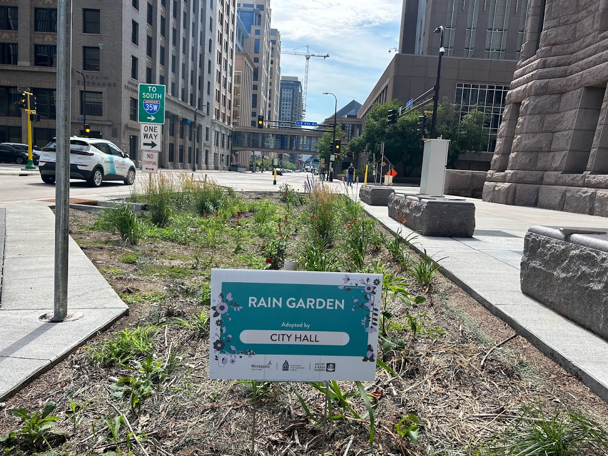 A rain garden may look like a typical planting bed, but it’s actually designed to absorb “stormwater runoff,” or the water that runs off sidewalks and road surfaces while it’s raining. In a traditional streetscape, stormwater runoff picks up many pollutants from impervious surfaces and is funneled into a storm drain that flows to the river. In a rain garden, stormwater flows in via an inlet before entering a drain, allowing deep-rooted native plants to filter pollutants from the water before it gets to the river. The native plants provide enhanced green space throughout downtown as well as habitat for pollinators, including bees, butterflies, moths, and birds.